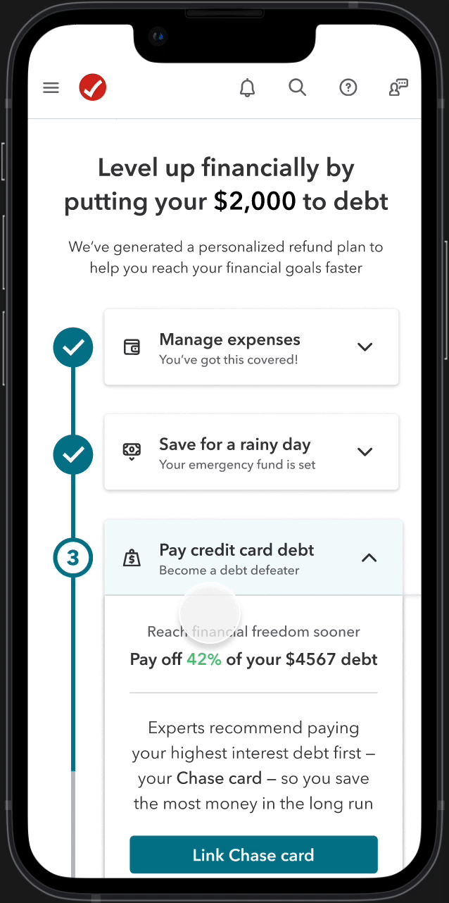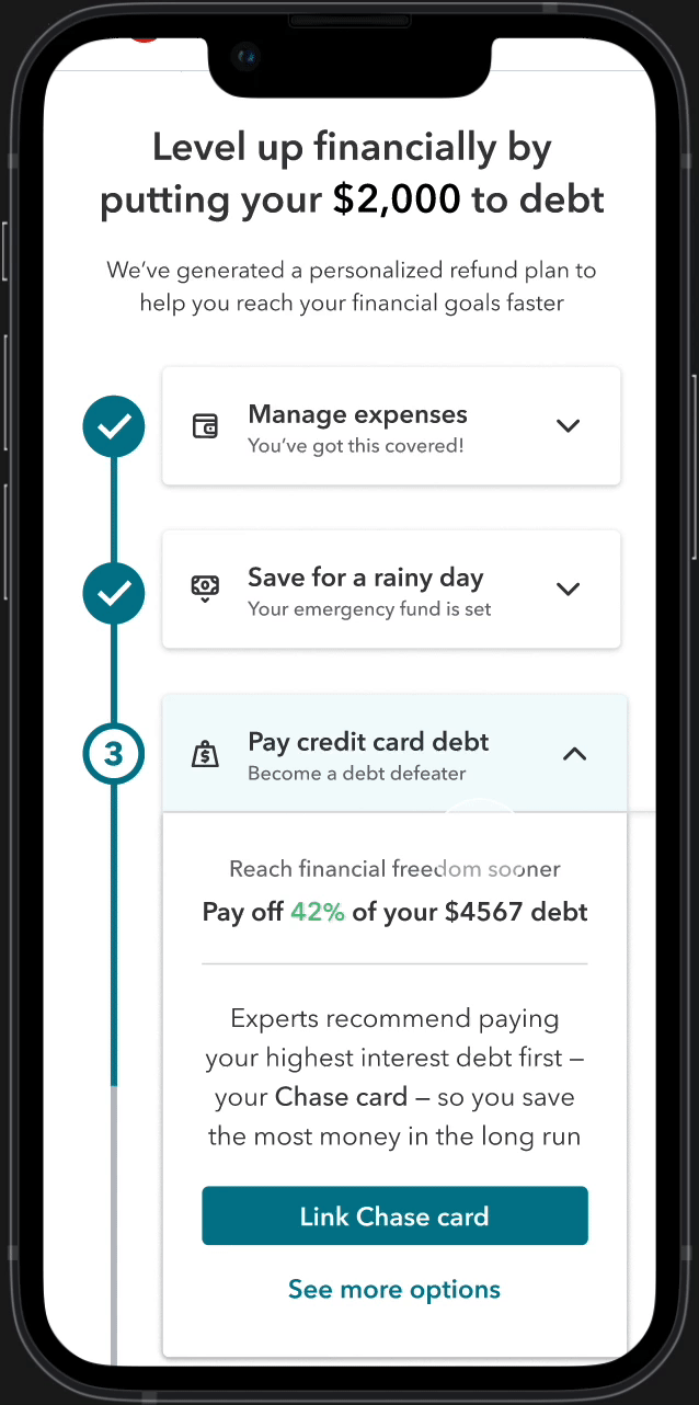 Immediately put your refund to work through the recommended options, with direct linkages to your account and the ability to split refunds among multiple financial goals.