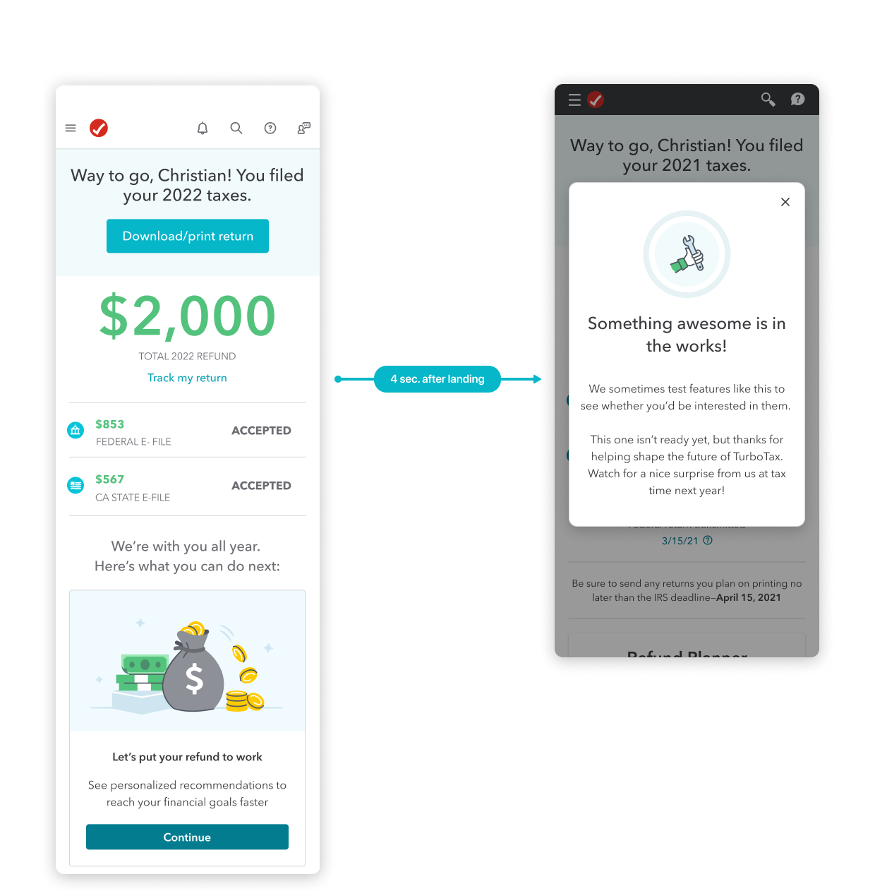 During Summer 2022, I joined Intuit as a Product Design Intern on the TurboTax Flagship team. Over the course of 9 weeks, I worked primarily on the How to Spend Your Tax Refund project, which aimed to help 18.2M low-income TurboTax users decide the best way to user their tax refund towards meeting their financial goals. I designed the MVP experience, with the dry test planned for release in Q3.